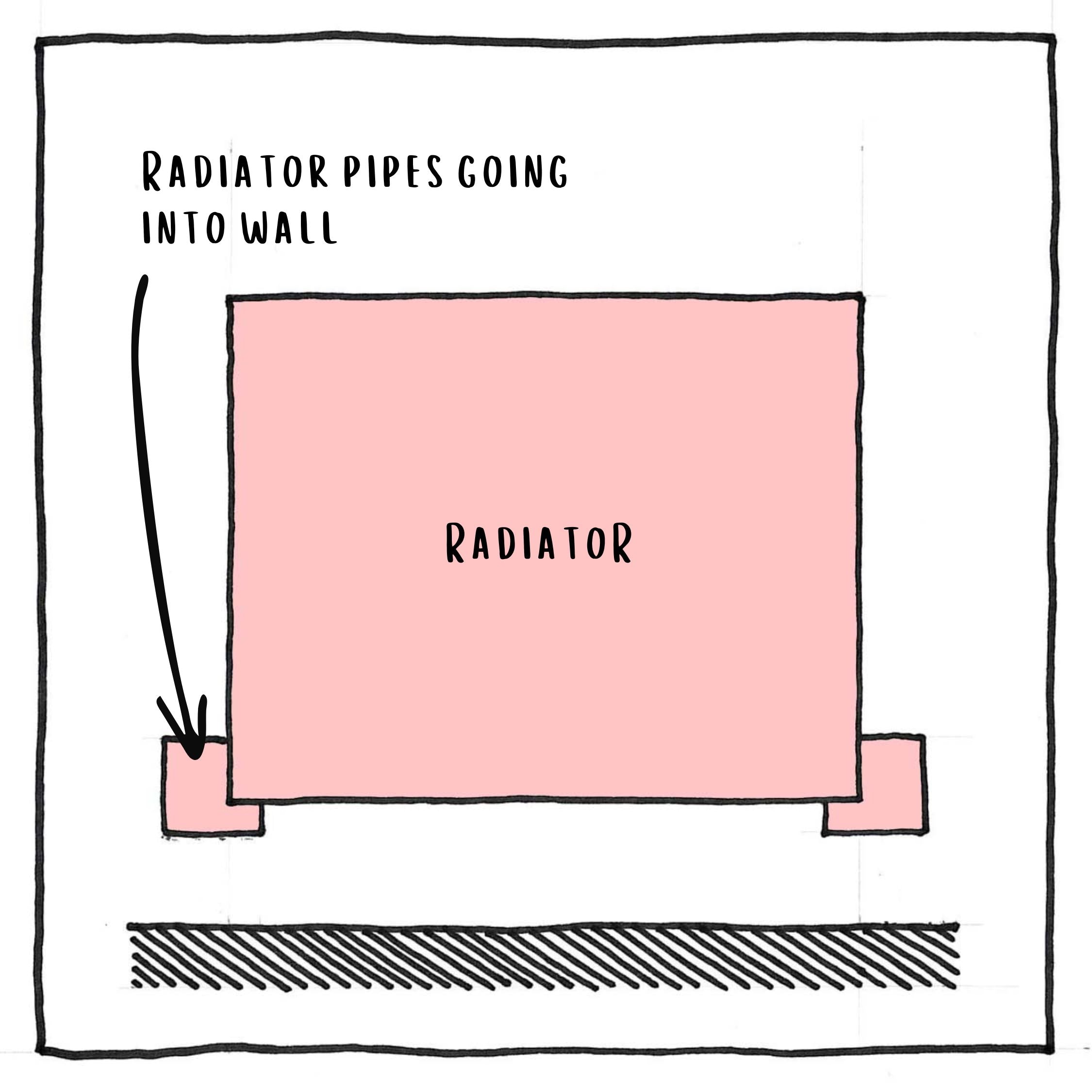 Radiators come in all different shapes, sizes and positions, however the most common type has large rectangular body, with piping/valves in the bottom corners that run into the wall.