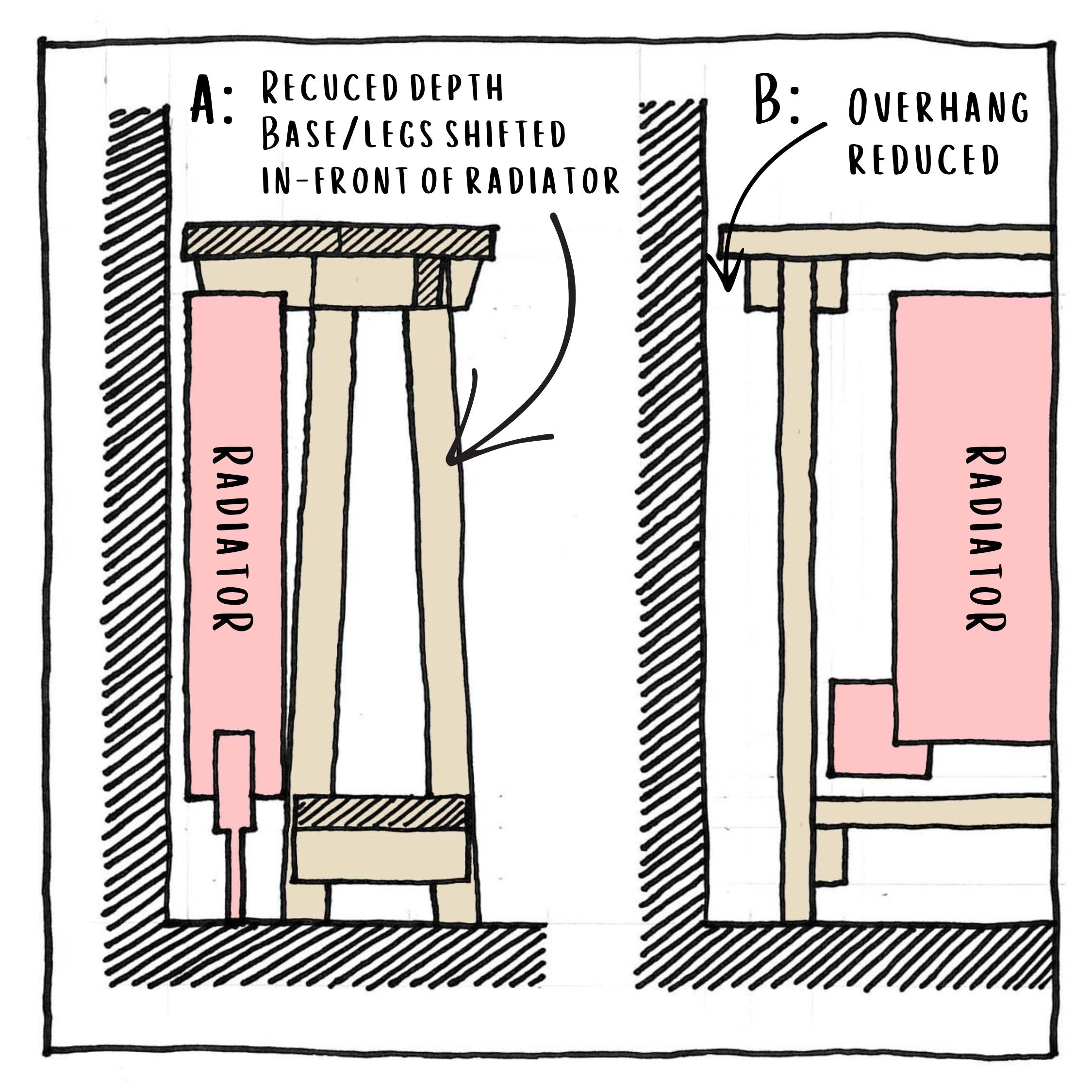 Or, reducing the overhang of the console at either end for radiators close to an adjacent wall (B).