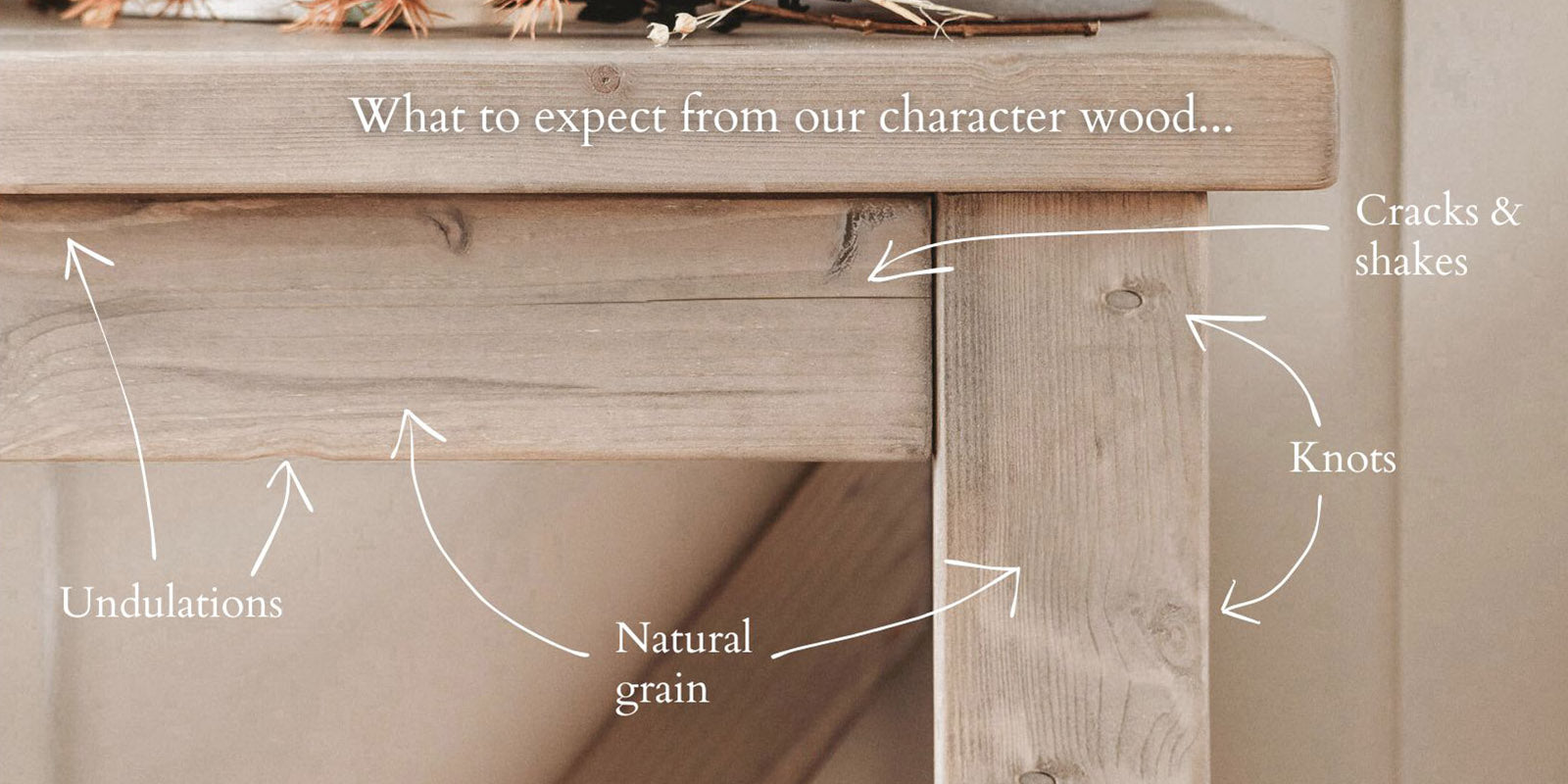 Our carefully hand-selected timber is full of character and individual charm with knots, small cracks, small indents, knot holes and shallows a common characteristic which makes each table totally unique. All rustic imperfections in the wood are carefully assessed to ensure they enhance the characterful appearance and high quality finish of the surface. The grain and colour of each table is individual to each plank of wood so the finish may vary subtly from the reference images provided. If this is a concern, contact us before purchase and we can send a colour sample to you for a small charge.